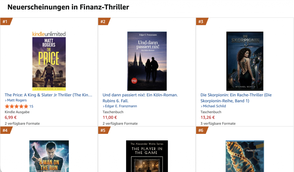 Amazons Hitlisten sind schnell und flüchtig, trotzdem habe ich mich gefreut, dass mein neuer Köln-Roman „Und dann passiert nix!“ nur einen Tag nach seiner Veröffentlichung auf Platz 2 in der Kategorie „Neuerscheinungen Finanz-Thriller“ auftauchte.